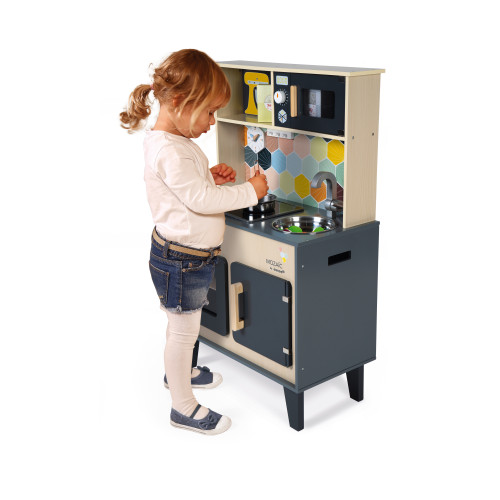 Prepare tasty little dishes for your friends, just like mom and dad, and become a Little Chef!!! Mozaïc big cooker is made from wood and has a utensil hook for hanging 1 skimming ladle, 1 saucepan and 1 metal colander, and 3 cardboard food boxes (cheese, flour, rice). Just like a real kitchen, it has a hob complete with LED and sound effect: simply press the red buttons once to see the hob rings light up, then a second time to hear water boiling. The sound and hob rings switch off automatically after 30 seconds or by pushing the red buttons a third time. This fantastic, fully equipped kitchen also has an oven, a microwave, a cupboard, 3 knobs with sound effects, a stainless-steel sink and a clock. 6 accessories. 2 LR6 - 1,5V alkaline batteries required (not included).