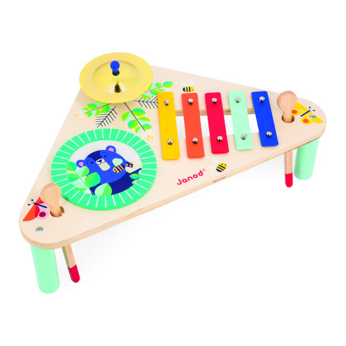 Let imagination resonate! Immerse yourself in a world of sounds and rhythms with our wooden musical table for babies aged 12 months and up. This early-learning musical toy is a real orchestra at your fingertips. It comprises 3 instruments: a drum, cymbal and a five-tone metal xylophone. Each instrument will introduce little ones to music as they discover the world of sounds in a fun and interactive way. Furthermore, this musical table boasts an integrated storage space for the drumsticks, so you won’t have to worry about losing them. Imagine your child’s joy-filled face as they hold the two sticks provided and explore the different sounds each instrument can produce. Each drum beat, cymbal chime or xylophone tone is a new musical adventure. In short, our wooden musical table for children is much more than a simple early-years toy. Musical exploration is on the cards as it opens the door to a universe of baby-suitable sounds and rhythms. Take the time to point out all the activity table’s pretty illustrations to your child: bees, butterflies and their new friend, the bear! So, are you ready to embark on a musical adventure? This sound toy is part of our Gioia range; a joyful musical awakening is in store for little ones as they discover many a sound in a fun, sharing-focused way.