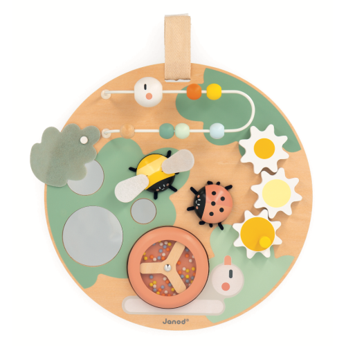 A multitude of activities at their fingertips! With this wooden activity panel, babies aged 12 months and up will learn through play. This early-learning toy has been designed to stimulate hearing, sight, touch and fine motor skills, whilst ensuring many an hour of discovery-filled play! Baby can choose from the 7 fun activities: 3 flower-shaped gears to turn via the knob or petals, 1 bee that makes a noise when turned, 1 ladybug that screws and unscrews, 1 caterpillar-shaped abacus to slide time and time again, 3 mirrors to observe one’s reflection, 1 snail whose shell turns and spins the coloured beads within and 1 ultra-soft felt leaf that can be moved to reveal a fun distorting mirror underneath. All the activities offered by this early-years toy have been designed for baby to experiment and discover through manipulation. At 1 years of age, it is by touching and observing that little ones begin to learn how their environment works. Another advantage of this baby activity board is its modularity: it can be installed according to your child's playing position. It can be hung on a wall, the bars of a cot, etc., via the Velcro strap on the top. Little ones can also position it inclined at 45°, thanks to its removable stand tucked away at the back: this way, baby can play sitting or seated at a table. This activity panel arouses curiosity and invites your little one to explore with their fingertips, thus stimulating their dexterity at their own pace. With its natural wood, soft colours, varied textures and sound functions, this is a complete and modular early-learning toy. A snail, bee, ladybird and caterpillar mingle with flowers and foliage on this baby’s activity board to help awaken their senses. This activity panel is made from certified wood and part of our Sweet Cocoon collection.