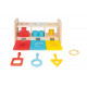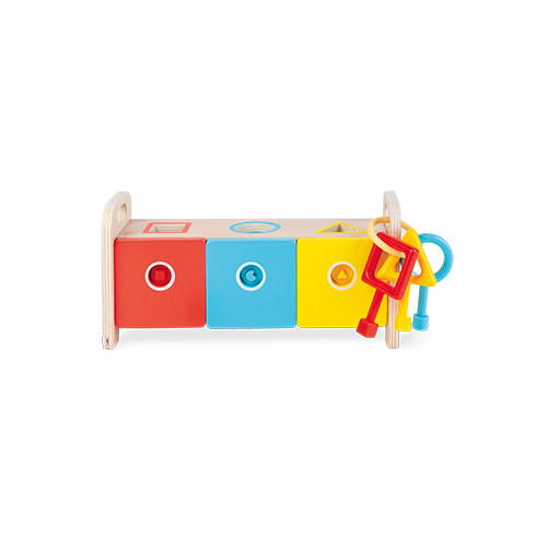 This key box is ideal for developing children’s dexterity while having fun. To open the doors and recover the pieces inside the box, children must choose the right key to match the lock. A very clever feature is the transparent back part of the box, which makes it possible to see the pieces falling into the compartment and shows the number and type of blocks placed. The convenient magnetic key ring fits around the wrist or box handle to prevent key loss. Comes with 6 blocks (1 yellow triangle, 2 blue round pieces, 3 red squares) and 3 plastic keys. This toy develops hand-eye coordination and cause-effect relationships.